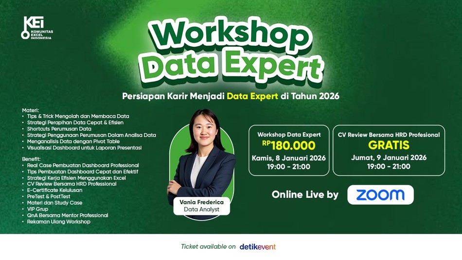 Tidak hanya materi pembelajaran, kamu juga mendapatkan berbagai benefit seperti real case pembuatan dashboard, strategi kerja efisien menggunakan Excel, CV review bersama HRD profesional, e-certificate, pretest dan posttest, materi studi kasus, VIP grup, sesi tanya jawab, hingga akses rekaman ulang workshop. Workshop ini akan dibawakan oleh Vania Frederica, seorang Data Analyst berpengalaman yang siap berbagi strategi pengembangan karir di bidang data.