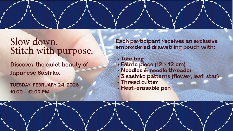 Temukan keindahan seni jahit tradisional Jepang di Workshop Japanese Sashiko. Belajar membuat pola bordir sederhana yang menenangkan dan cocok untuk pemula bersama Nining Irianingsih dari KAMACITTA. Kelas digelar Selasa, 24 Februari 2026 di Nextdoor by Pantry Magic, Kemang. Slot terbatas, daftar sekarang di detikevent!Deskripsi