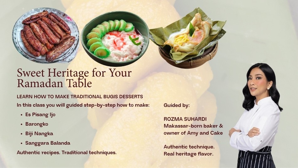 Rasakan manisnya tradisi Sulawesi Selatan di Workshop Hidangan Manis Tradisional Bugis bersama Rozma Suhardi dari Amy and Cake. Belajar membuat Es Pisang Ijo, Barongko, Biji Nangka, dan Sanggara Balanda, takjil khas Makassar yang lembut dan autentik. Kelas digelar Rabu, 4 Maret 2026 di Next Door by Pantry Magic, Kemang. Segera daftar di detikevent sebelum kehabisan!Deskripsi