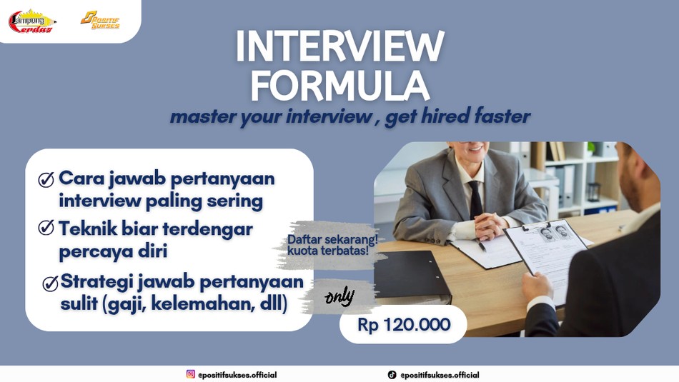 Di kelas ini, kamu akan belajar bagaimana menghadapi interview kerja dengan strategi yang tepat, mulai dari cara menjawab pertanyaan sulit, membangun kesan pertama yang kuat, hingga mengontrol rasa gugup saat proses interview berlangsung.