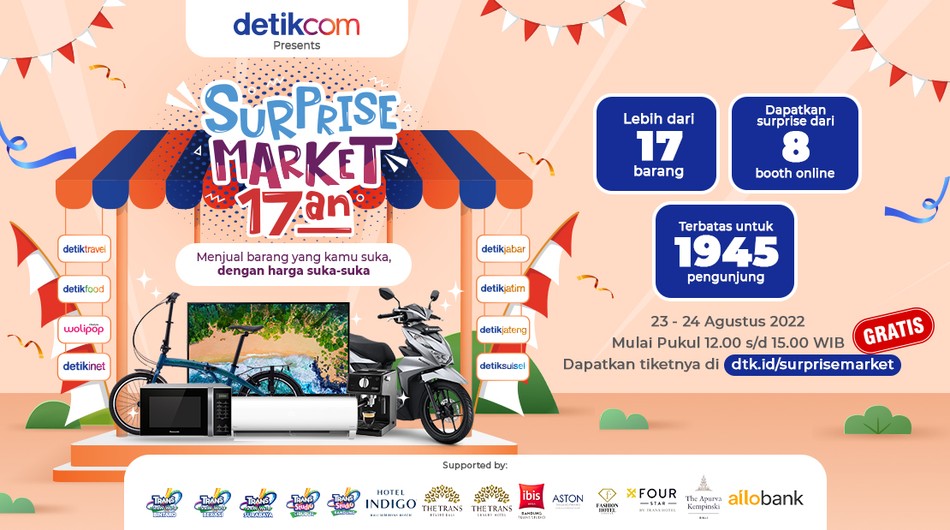 - Dapatkan tiket GRATIS “Surprise Market 17an detikcom” di event.detik.com paling lambat 24 Agustus 2022
