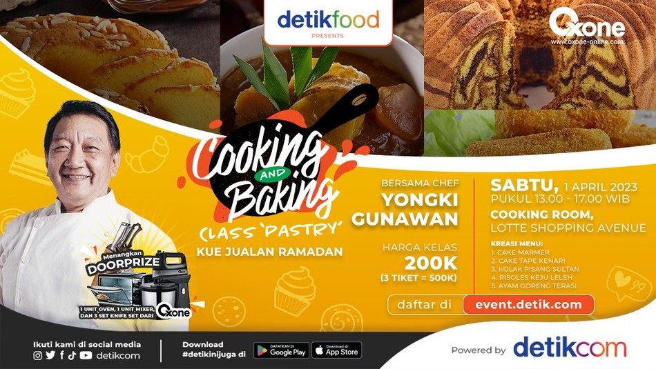Cooking & Baking Class 2023 “Class Pastry : Kue Jualan Ramadan” merupakan kelas memasak yang akan dipandu oleh Chef Yongki Gunawan. Chef Yongki ini jagonya masakan Nusantara dan baking lho detikers!