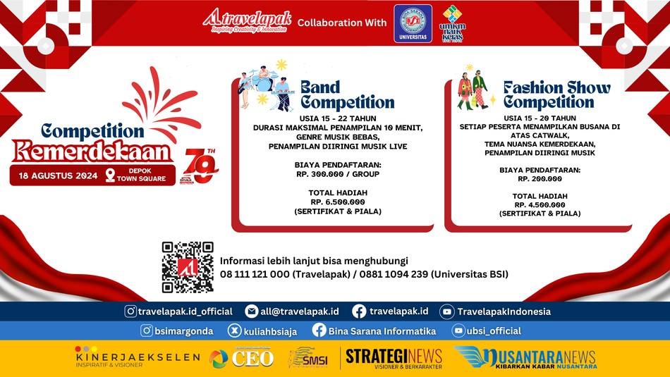 Event Kemerdekaan adalah sebuah acara yang di dedikasikan untuk putra putri bangsa sebagai wadah untuk mengapresiasi budaya seni yang ditampilkan oleh talenta-talenta muda Indonesia. Ada berbagai kategori lomba yang dapat kamu ikuti, simak selengkapnya di bawah ini: