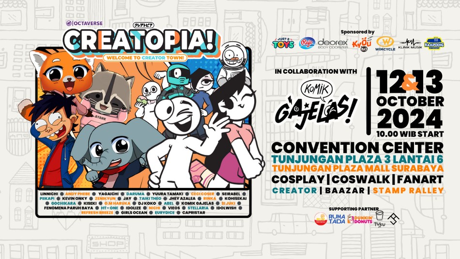 Jangan lupa dateng di CREATOPIA 2024 ialah event pop-culture terbesar di Jawa Timur Dengan lebih dari 30+ Guest Star & Performance dari berbagai kota di Indonesia berkumpul di Convention Center TP3 Lt. 6, Tunjungan Plaza Surabaya ya!Deskripsi