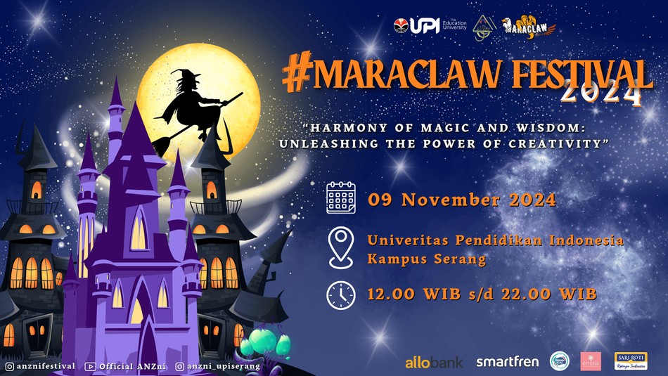 Panggilan untuk seluruh masyarakat Banten dan sekitarnya! Bersiaplah untuk merasakan keajaiban sihir. Rasakan sensasi berbeda seperti di dalam dunia sihir pada acara #MARACLAW FESTIVAL 2024. Acara ini merupakan suatu bentuk perayaan yang akan menampilkan bakat minat keren di bidang kesenian. Dapatkan pengalaman magis dengan mendengarkan musik akustik, menyaksikan penampilan tari yang memukau, dan bertemu dengan para penyihir dari berbagai penjuru.