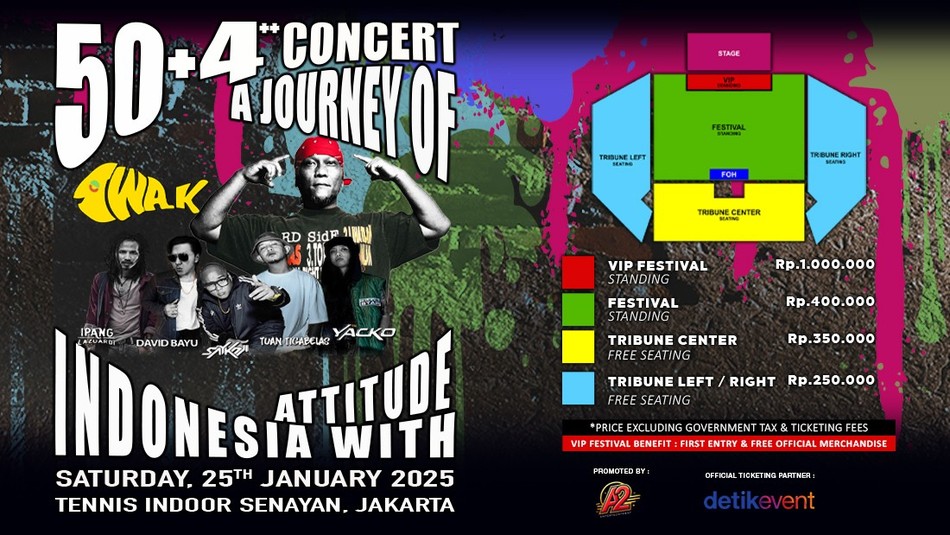 Dalam Kesempatan ini, A2 Entertainment akan menyelenggarakan Konser 50+4++A JOURNEY OF IWA K bertempat di Tennis Indoor Senayan Jakarta.