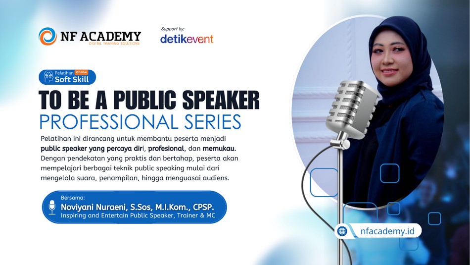 Kami mengundang Anda untuk bergabung di acara To Be a Public Speaker Profesional Series bersama NF Academy. Kesempatan emas untuk belajar teknik berbicara yang memukau, percaya diri di panggung, dan menginspirasi banyak orang!. Pelatihan ini dirancang untuk membantu peserta menjadi public speaker yang percaya diri, profesional, dan memukau. Dengan pendekatan yang praktis dan bertahap, peserta akan mempelajari berbagai teknik public speaking mulai dari mengelola suara, penampilan, hingga menguasai audiens.