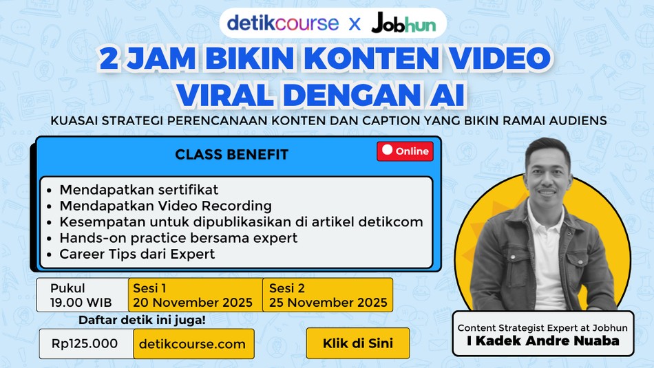 Ubah cara kamu bikin konten lebih cepat, lebih cerdas, dan tetap viral di kelas 2 Jam Jago Membuat Konten Viral dengan AI. Daftar kelasnya sekarang juga melalui detikevent!