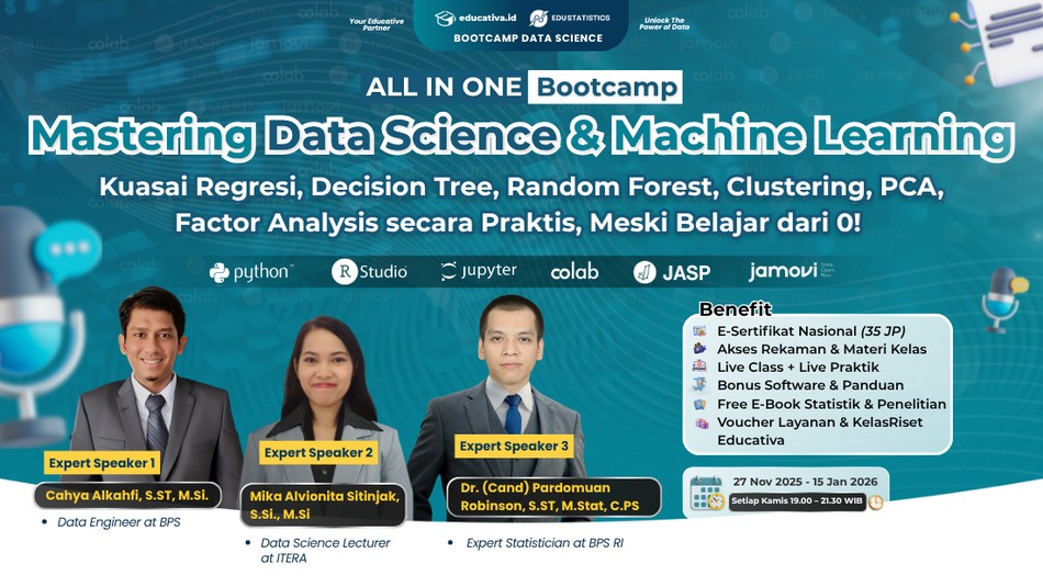 - Mengenal dan praktik langsung menggunakan software profesional (RStudio, Python, Jupyter, Google Colab, JASP, JAMOVI).