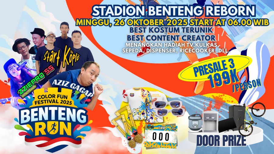 Di bawah naungan Muda Mudi Nusantara, acara ini hadir bukan sekadar lomba lari. Kamu akan merasakan euforia lari penuh warna dalam Benteng Run, Color Run Festival 2025. Ada color run, foam party, musik, hingga penampilan spesial dari Aziz Gagap yang siap bikin kamu terhibur, serta Start Koplo yang bakal bikin panggung semakin pecah!