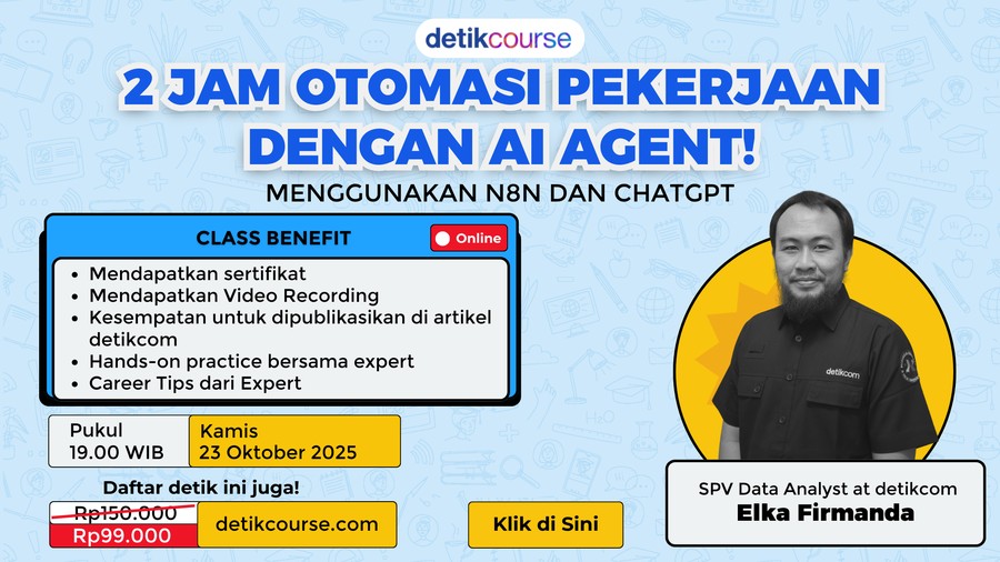 Selain mendapatkan materi praktis dan rekaman kelas (VOD), kamu juga akan memperoleh E-Certificate, template workflow AI siap pakai, serta kesempatan untuk ikut sesi Q&A interaktif bersama mentor berpengalaman. Yang lebih menarik lagi, kamu berpeluang jadi peserta terbaik yang akan tampil di artikel detikcom!