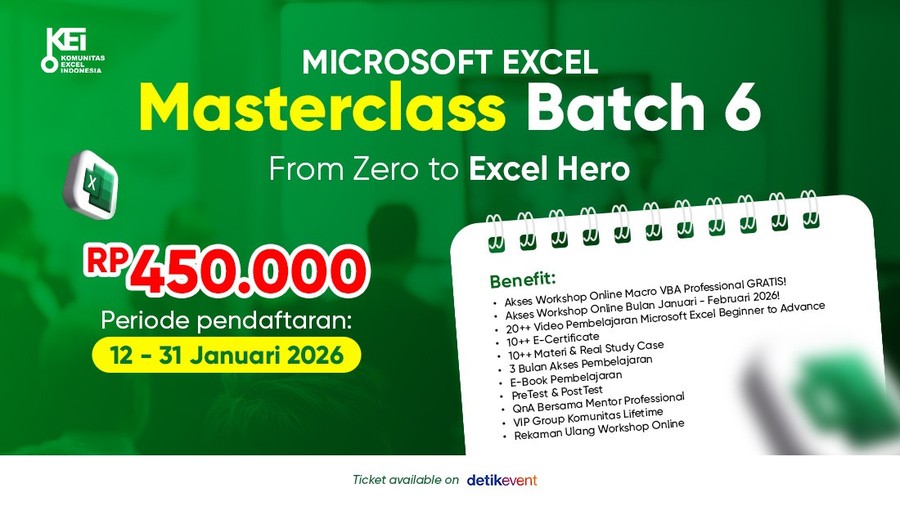 Saatnya upgrade skill Excel untuk mendukung tugas harian dan meningkatkan nilai jual di dunia kerja. Daftarkan diri kamu sekarang dan ikuti Excel Masterclass Batch 6 hanya melalui detikevent!