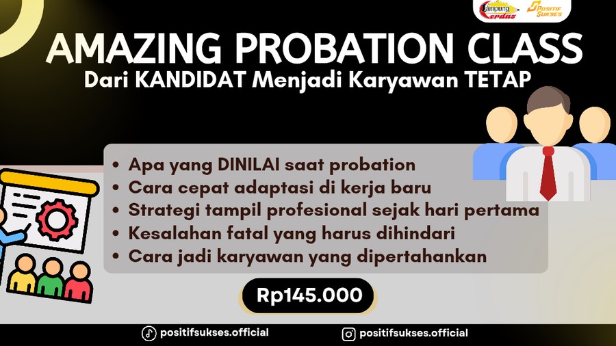 Untuk membantu kamu menjalani masa ini dengan lebih terarah, Amazing Probation Class: Dari KANDIDAT Menjadi Karyawan TETAP hadir sebagai panduan praktis. Kelas ini dirancang untuk membekali kamu dengan strategi yang relevan dengan kondisi kerja nyata, mulai dari memahami pola penilaian perusahaan hingga cara meningkatkan performa tanpa harus mengorbankan keseimbangan kerja.